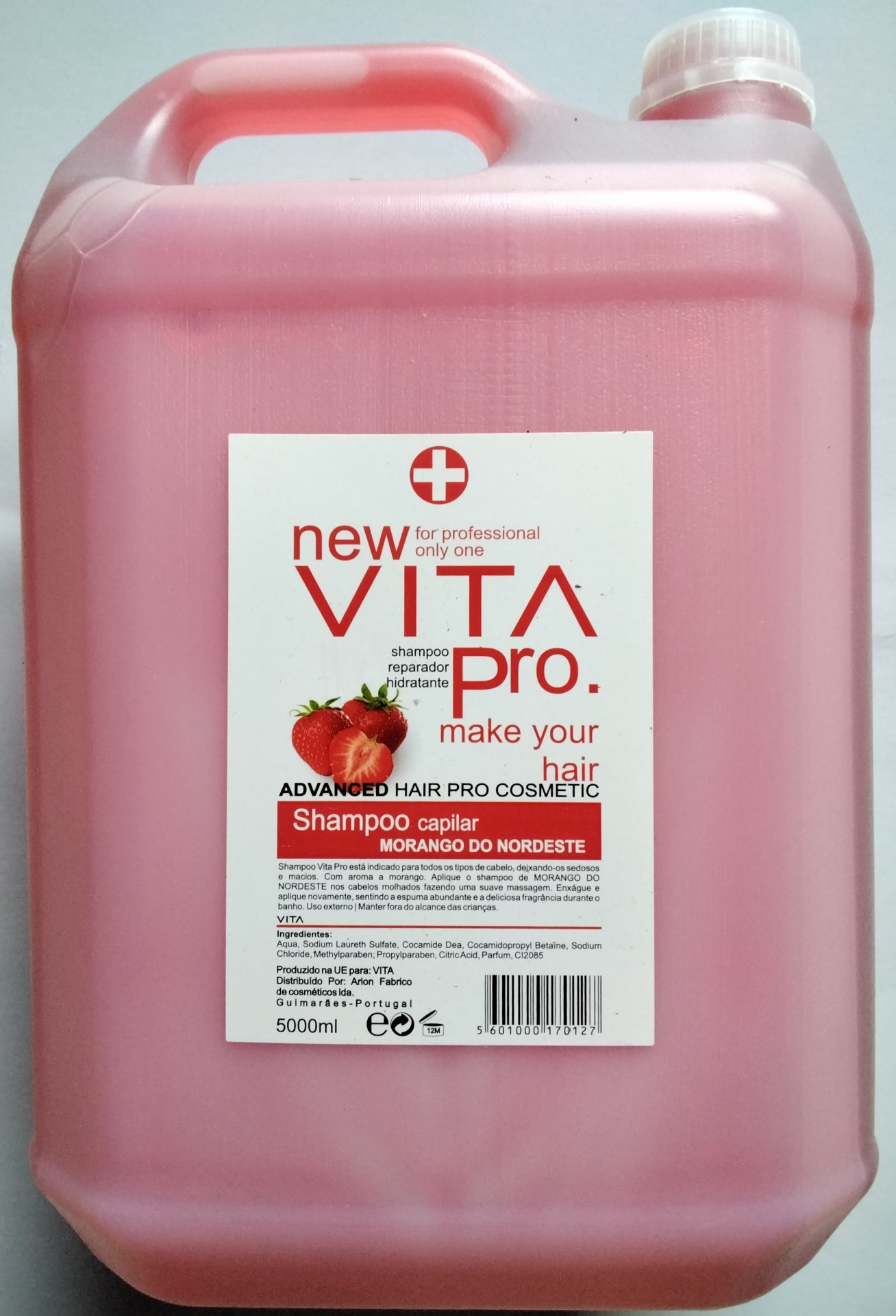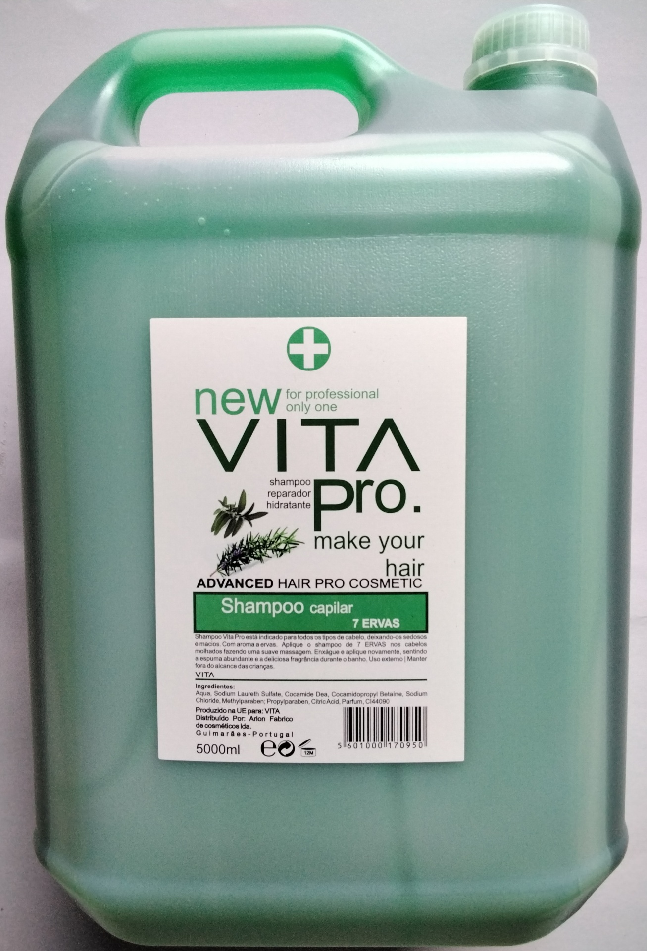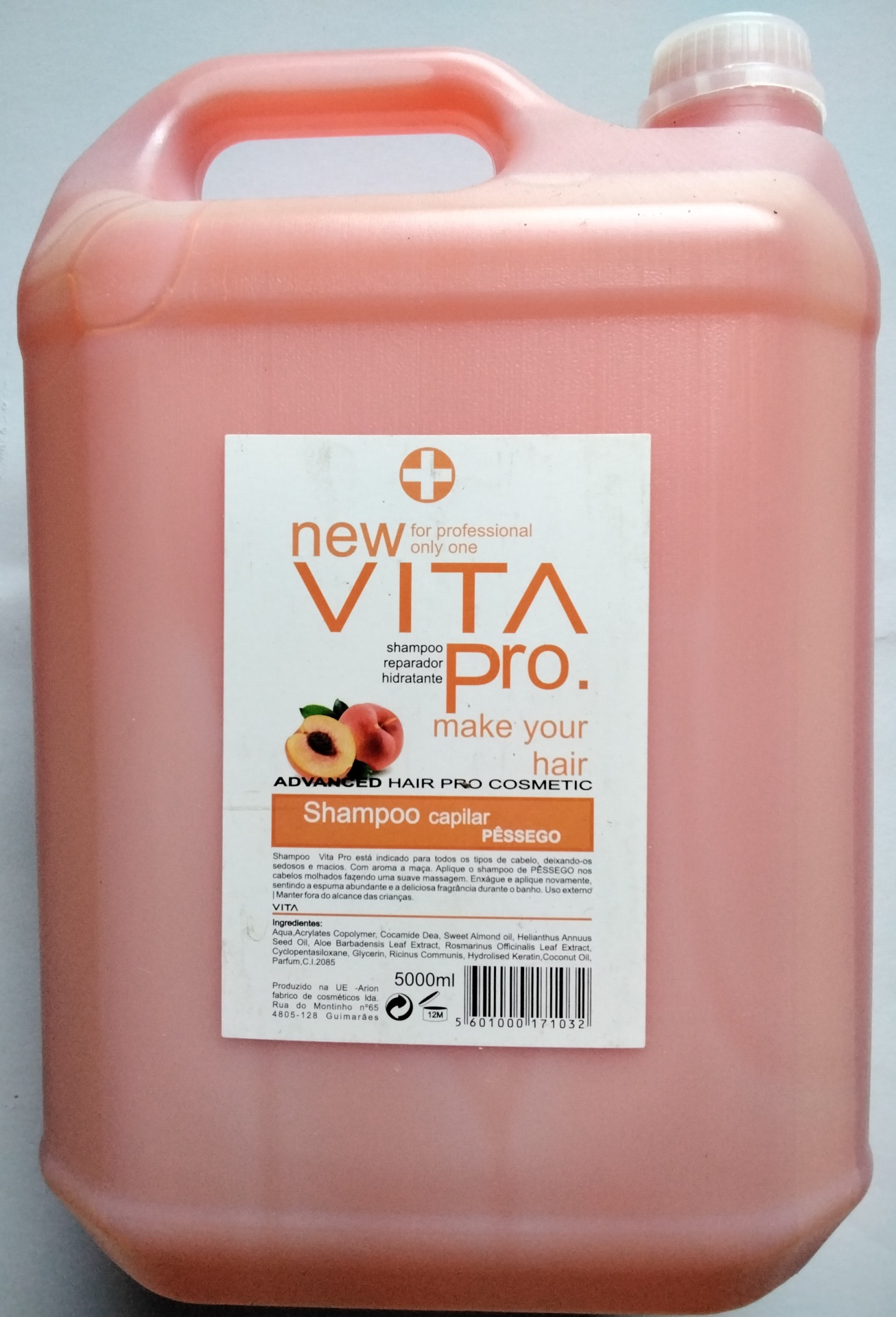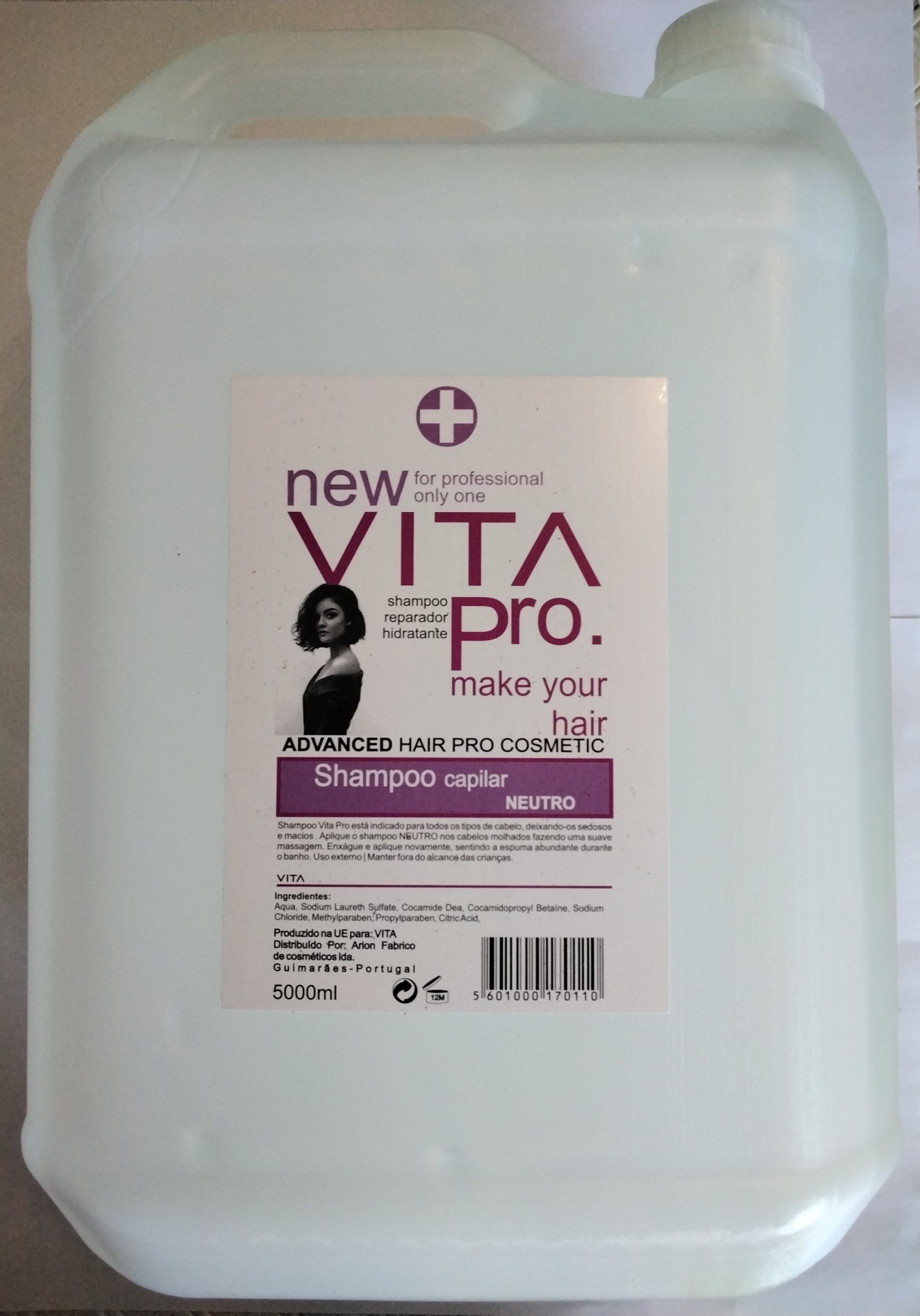 Frasco branco de shampoo VITA pro. 5000 ml com rótulo roxo e preto