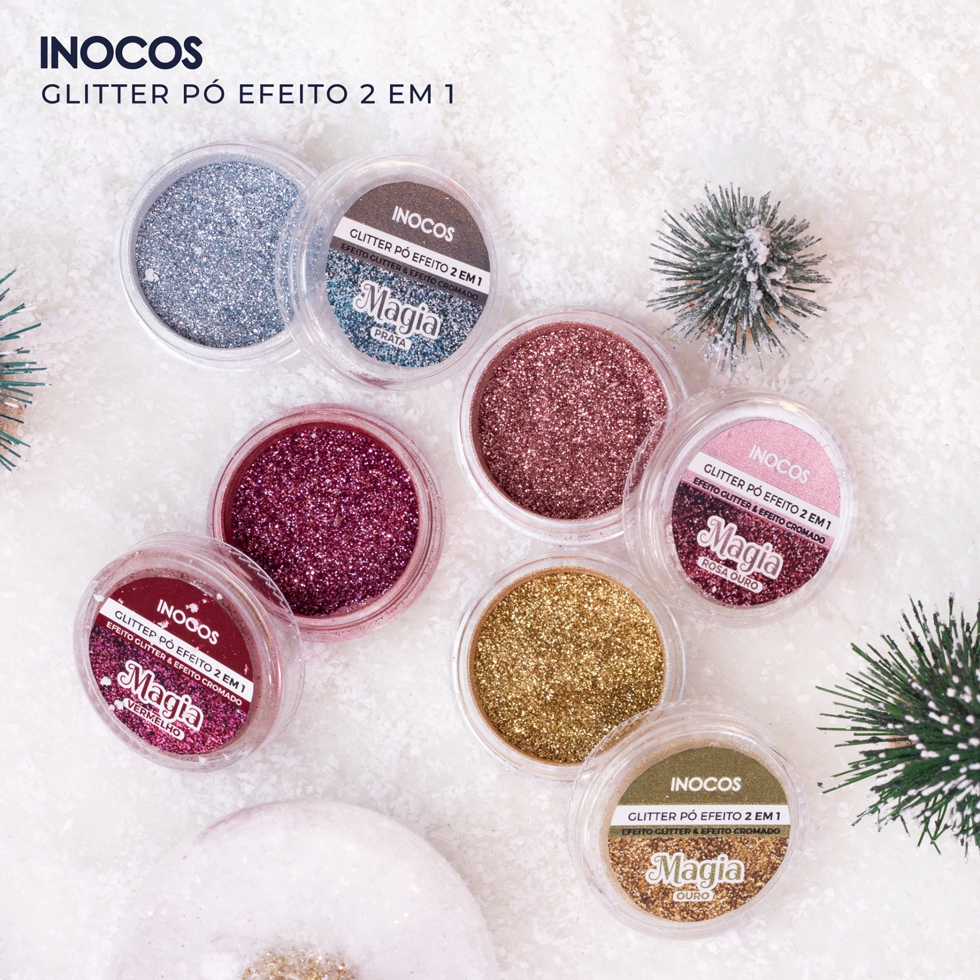 Glitter em pó INOCOS de várias cores em recipientes transparentes com tampas rotuladas sobre superfície branca com decoração natalícia.
