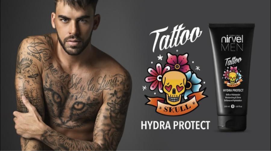 Homem tatuado ao lado de tubo preto do produto Hydra Protect Tattoo da marca Nirvel MEN